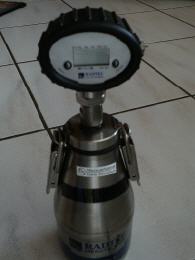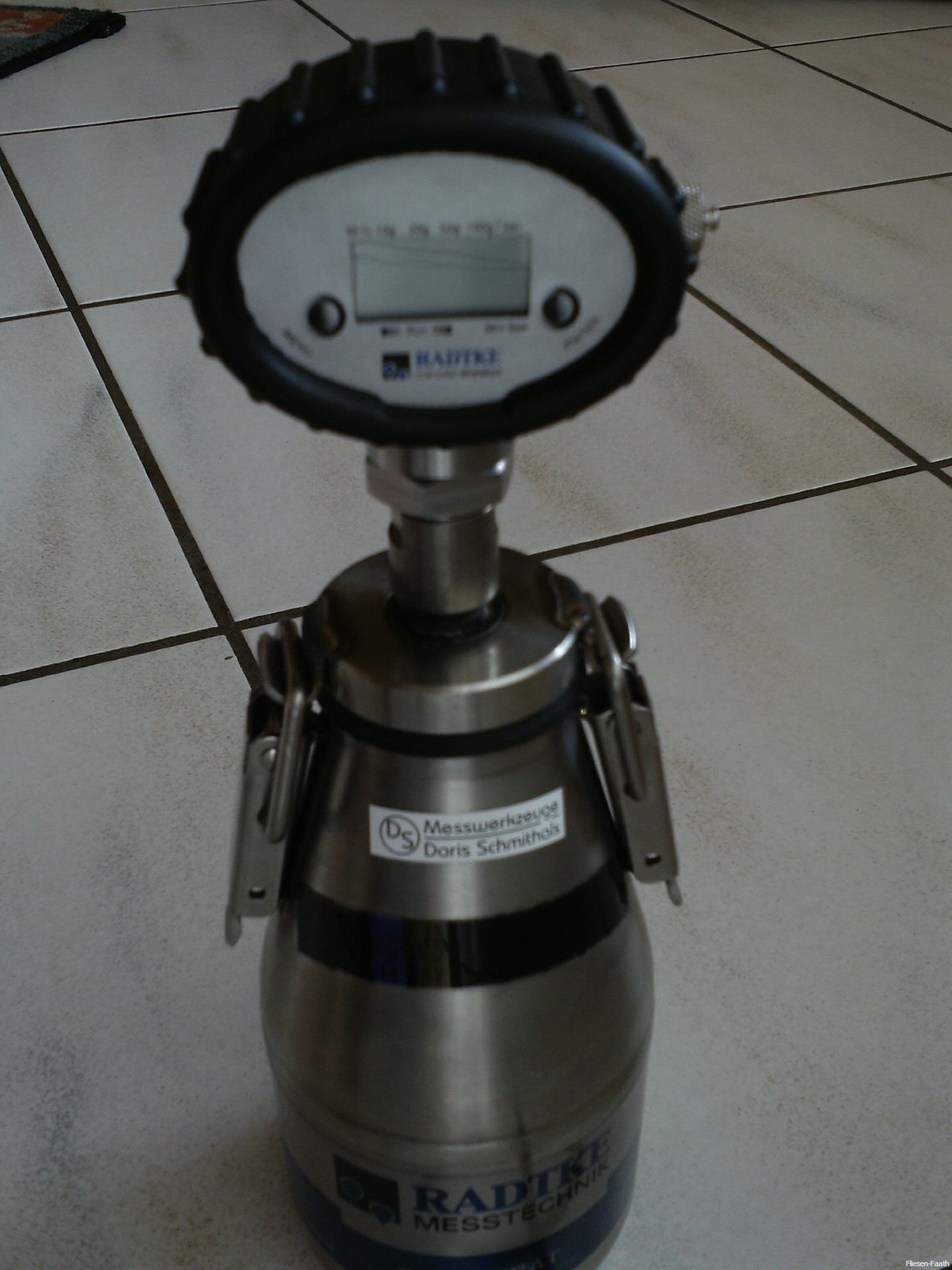 Die Feuchtigkeit der entnommenen Estrichprobe reagiert mit Calzium-Carbid, es entsteht Druck, der am Manometer die noch vorhandene Feuchtigkeit in Prozent % anzeigt.